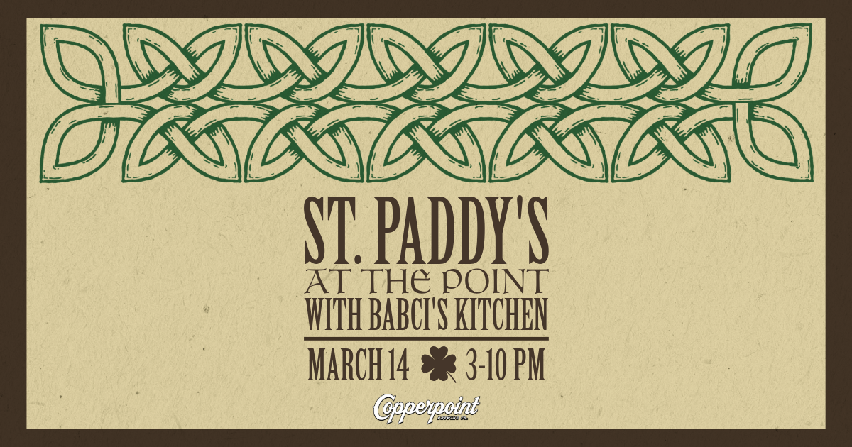 Join us at The Point for a St. Paddy's celebration. Our pals from Babci's Kitchen will have banger Irish themed menu and we'll have some beer specials.